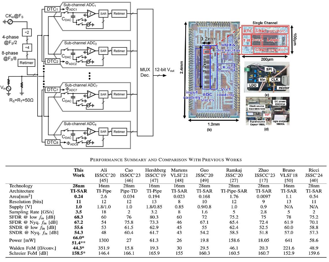 3.5 GS/s 11-bit eight-channel time-interleaved SAR ADC, integrating eight high-speed 440 MS/s subchannels and eight phase clock generation circuits on-chip. Performs one-time calibration of channel offset and clock skew in the analog domain, achieving a 54 dB signal-to-noise distortion ratio at the Nyquist input frequency.