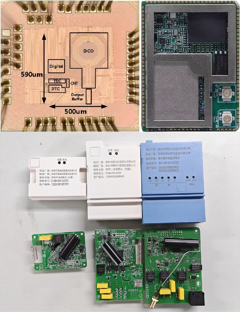 (左上)带有前馈增益校准的全数字射频锁相环芯片(右上)无线图传与视觉处理模组(下)双模通信模块样机